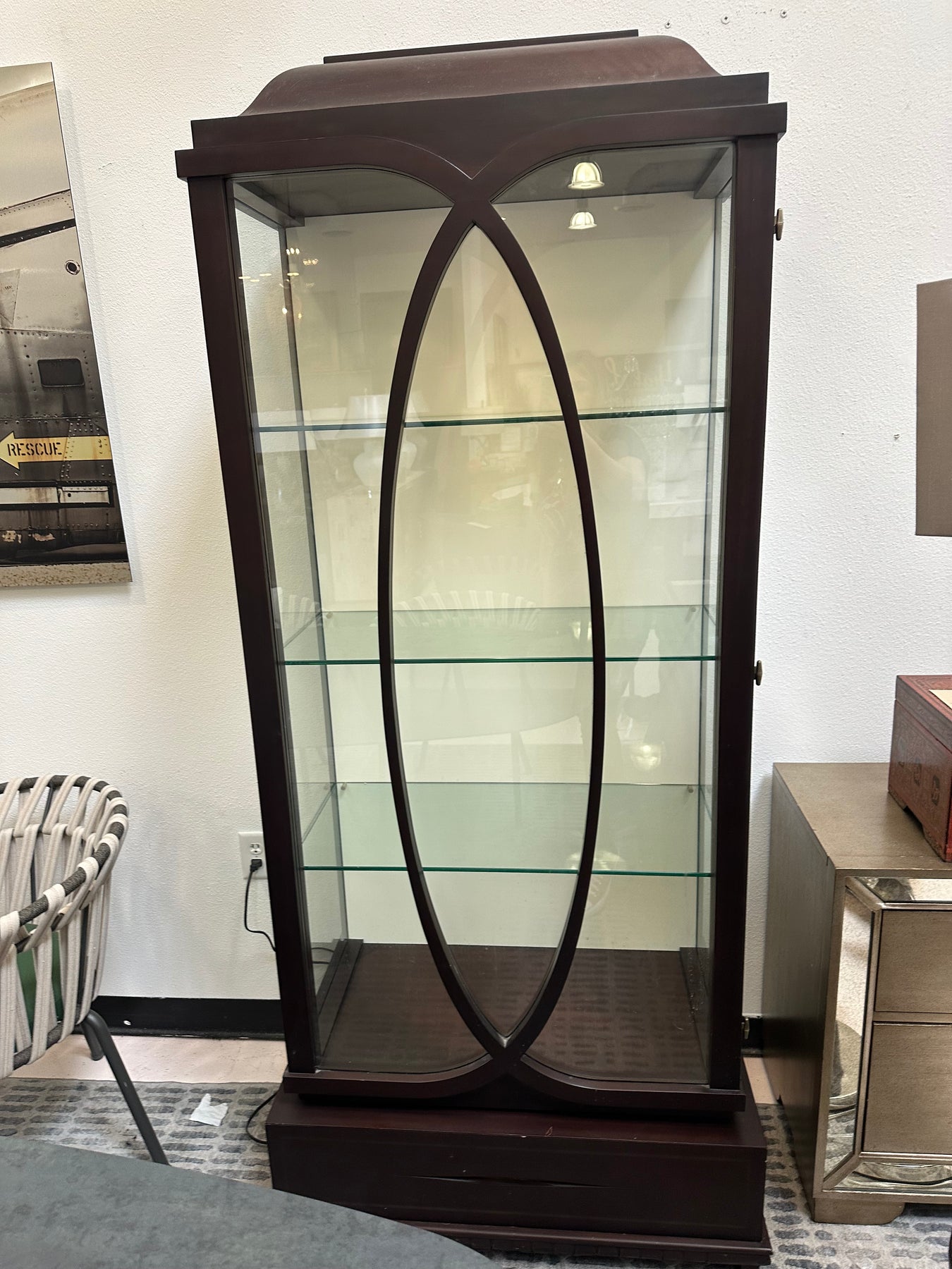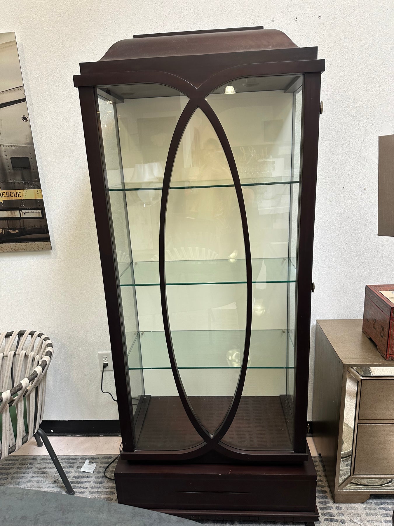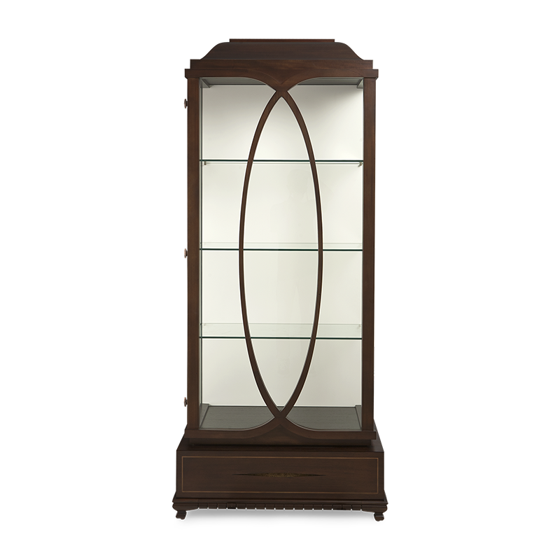 A breathtaking mahogany display cabinet, unrivaled for showcasing fine objets d'art. The lower drawer face displays a fine inlay border, including Christopher's Silk-cut signature detail. This unit includes a built in spotlight.