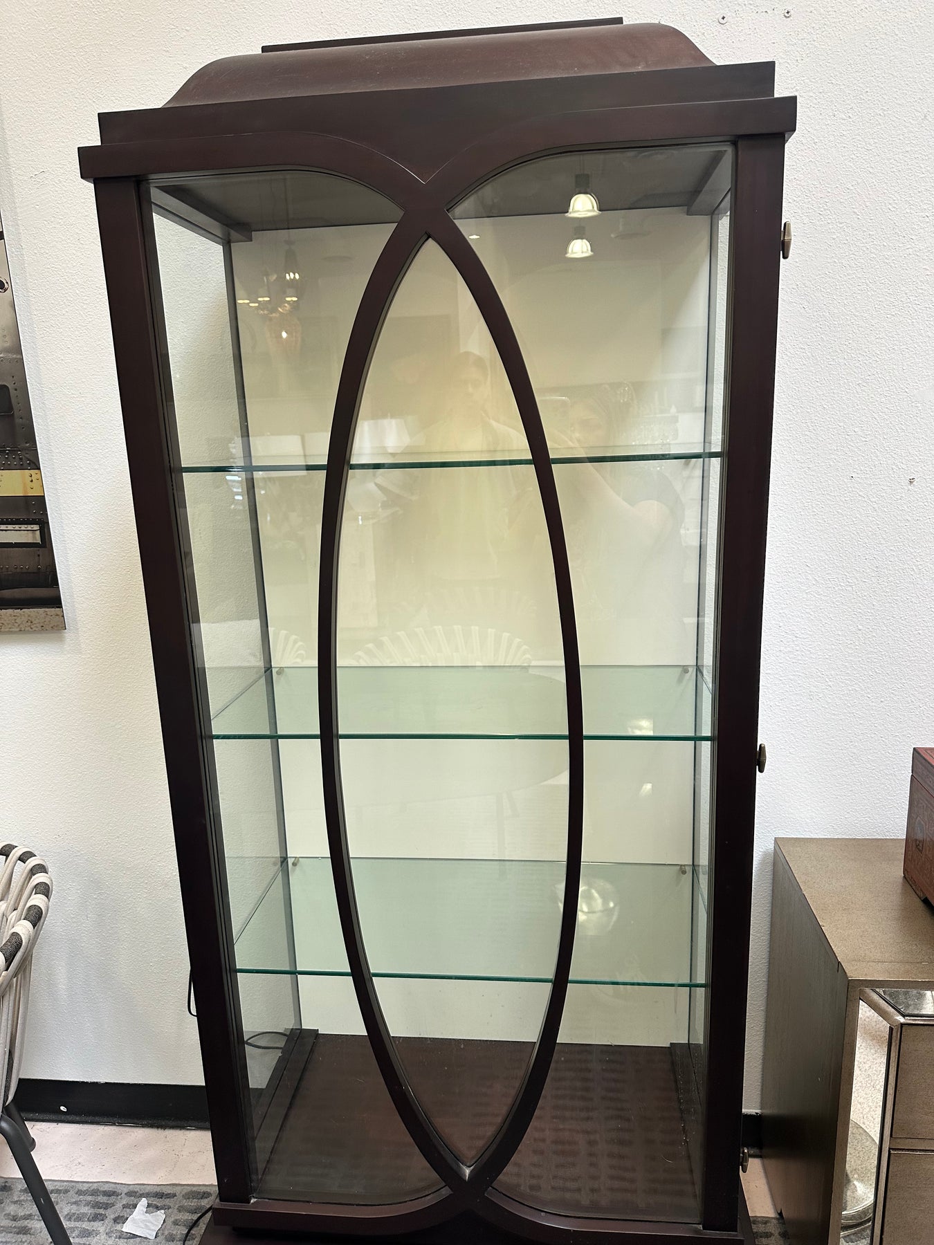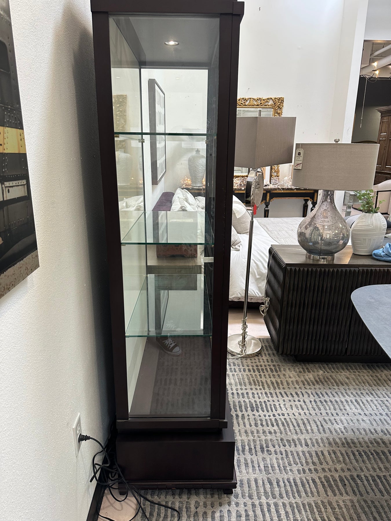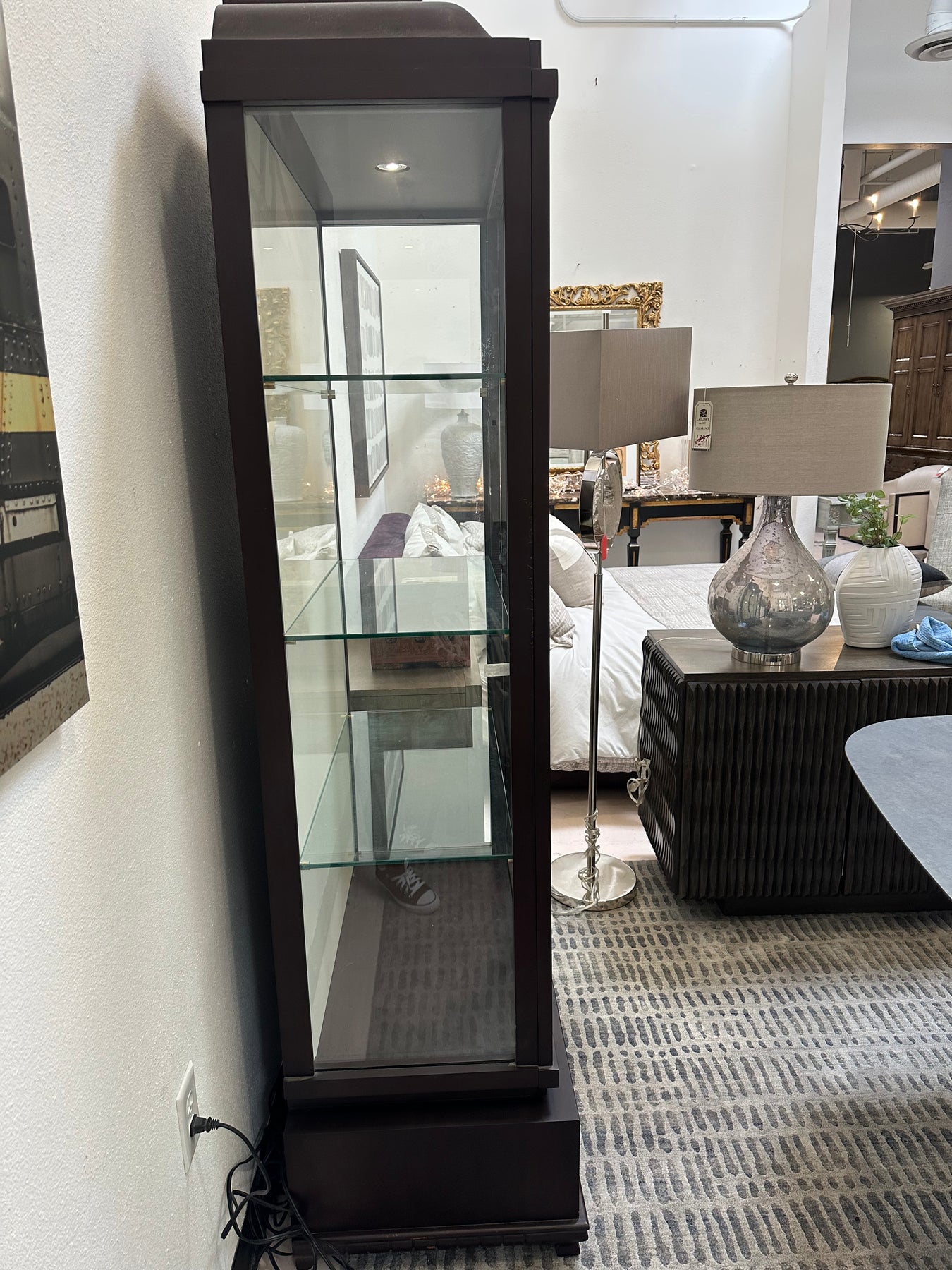 A breathtaking mahogany display cabinet, unrivaled for showcasing fine objets d'art. The lower drawer face displays a fine inlay border, including Christopher's Silk-cut signature detail. This unit includes a built in spotlight.